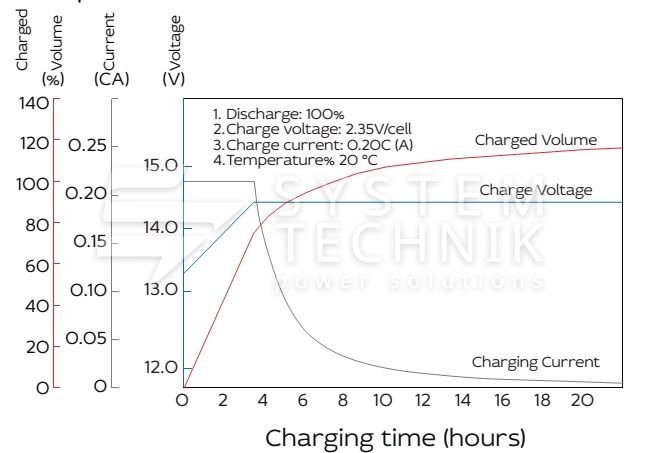 - Рекомендуемое напряжение заряда в циклическом режиме для 12В батареи: 13,5В-14,1В при 25ºС;
